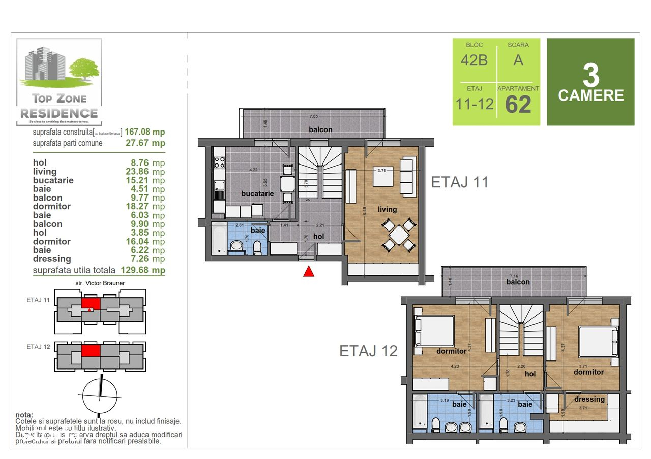apartament tip duplex 3 camere sector 3 bucurestide vanzare apartament tip duplex cu 3 camere situat pe strada victor brauner in sectorul 3 bucurestidetalii tehnicesuprafata construita cu balconterasa 16708 mpsuprafata utila totala 12968 mpsuprafata balcoaneterase 2767 mpcompartimentare moderna cu living spatios bucatarie 2 dormitoare 3 bai dressing si holuri generoase2 balcoane cu vedere panoramicaapartamentul se desfasoara pe doua niveluri etaj 11 si etaj 12caracteristiciimobil nou cu finisaje la rosu mobilierul prezentat in plan este cu titlu ilustrativposibilitate de personalizare a finisajelor dupa preferinteideal pentru familie datorita suprafetelor mari si compartimentarii eficientelocalizarezona linistita din sectorul 3acces rapid catre mijloace de transport magazine scoli si alte facilitati urbane- Caracteristici 2025-11-17