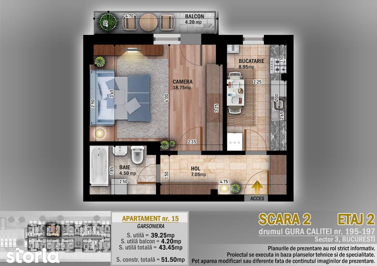 - Suprafata: 43m²